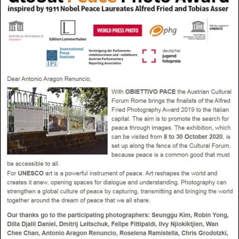 Mi trabajo nuevamente expuesto en Italia. Exposición de los trabajos finalistas del Alfred Fried Photography Award 2019 – Global Peace Photo Award en el Austrian Cultural Forum de Roma (Italia). La exposición podrá ser visitada del 8 al 30 de octubre.
