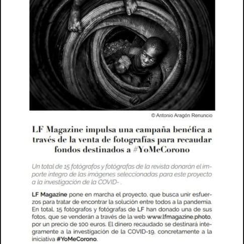 LF Magazine pone en marcha el proyecto #LFcontralacovid, que busca unir esfuerzos para tratar de encontrar la solución entre todos a la pandemia. En total, 15 fotógrafos y fotógrafas de LF han donado una de sus fotos, que se venderán a través de la web www.lfmagazine.photo por un precio de 100 euros. El dinero recaudado se destinará íntegramente a la investigación de la COVID-19, concretamente a la iniciativa #YoMeCorono. Los artistas que participan en esta iniciativa son Antonio Aragón Renuncio, Maite Caramés -el trabajo de ambos podrá verse también en el número 10 de la revista de LF sobre ecoactivismo-, Josep Bou, Jesús Chamizo, Álvaro Sánchez-Montañés, Álvaro Arroyo, Enric Maciá, Silvia Grav, Miguel López Tabar, Erika Arias, Koldo Badillo, Eva F. Mur, Adriana Roslin, José Ignacio Hernández y Marta Calvo.