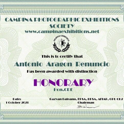 Es para mí un gran placer ser reconocido y recibir la distinción/título honorífico «HONORARY – HON.CPE«, el más alto reconocimiento de la Campina Photographic Exhibitions Society de Rumanía, por mi excelente trabajo y promoción del arte fotográfico en todo el mundo y por apoyar y promover las exposiciones organizadas por dicha organización.