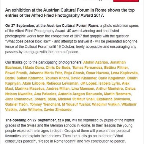 Estoy muy contento de anunciar que participo en la exposición «What does peace look like?» en la Austrian Cultural Forum Rome en Roma (Italia) del próximo 27 de Septiembre al 19 de Octubre.