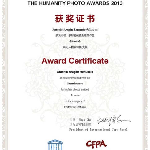 Esta vez premios por partida doble. Por un lado el máximo galardón, HPA Grand Award, en el Humanity Photo Awards de la UNESCO/CFA en la categoría de Portrait and Costume con el trabajo titulado «Somba» y por el otro; un HPA Nomination Award con el trabajo «The Sad Song of the Mermaid» en la categoría de Living and Production Custom. Tras la inauguración de la exposición en China las imágenes recorrerán el mundo en una exposición itinerante por los cinco continentes.