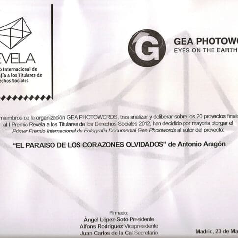 Por un lado el premio REVELA (I Premio Internacional de Fotografía a los Titulares de los Derechos Sociales), con una dotación de 15.000 euros que irán destinados íntegramente al proyecto de cirugía plástica y reconstructiva (principalmente en niños) que lleva desarrolando mi ONG desde hace más de 10 años por tierras africanas y por el otro; el Premio Internacional de Fotografía Documental GEA Photowords con el trabajo «El Paraíso de los Corazones Olvidados».