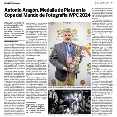 Noticia en el Diario Montañés del martes 30 de abril de 2024 sobre mis nuevos premios: Campeón del Mundo de la World Photographic Cup 2024 con el equipo Español y Subcampeón del Mundo (Medalla de Plata) en la categoría de Reportaje (Fotoperiodismo) a título individual.