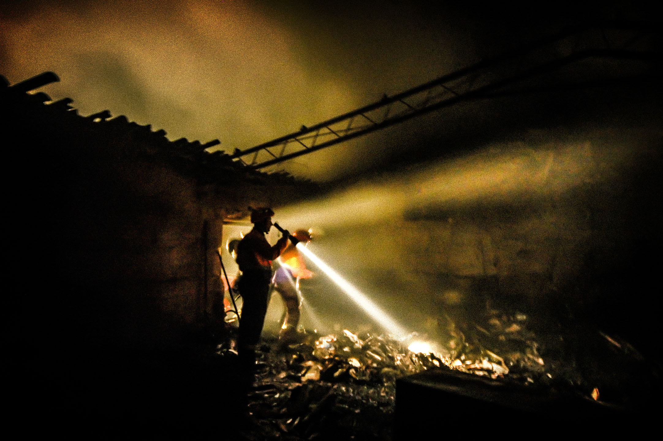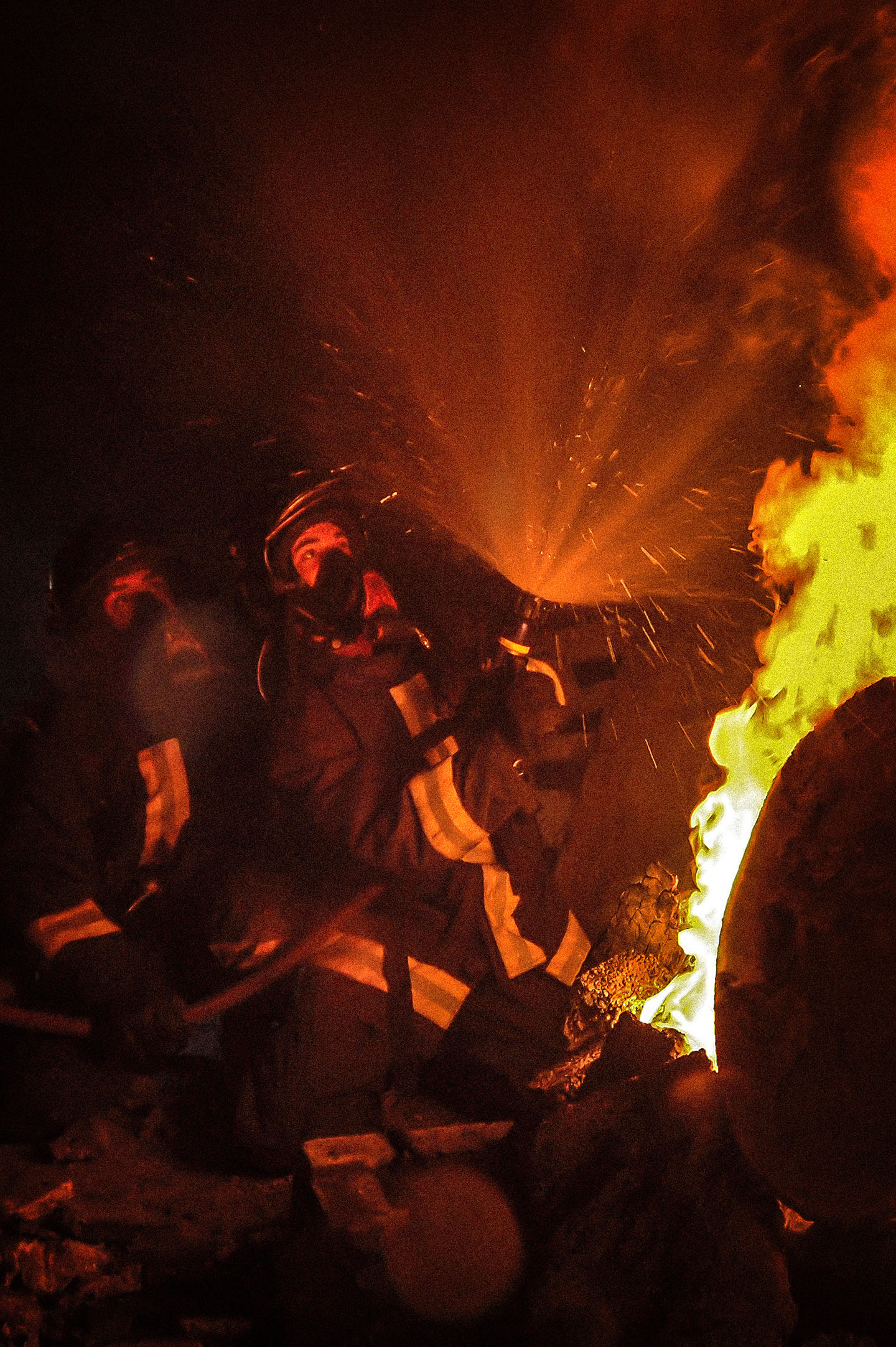 Humo caliente que todo lo cubre. La visibilidad se reduce. Se hace la noche. Densa noche de vapores incandescentes y negros, muy negros. El calor intenso del ambiente te absorbe, te sobrepasa. Y va empapando las escasas protecciones individuales del bombero que se llenan sin remedio de calorías, segundo a segundo, llama a llama, hasta el momento crítico de máxima saturación en que comienzan a desprenderse y nuestro pobre héroe particular, que se asa como una chuleta en la parrilla de una fiesta playera, recibe brutalmente esa energía que ya nada ni nadie puede detener. El miedo le va ganando y debe controlarse para evitar el pánico que le llevaría a quitarse la careta del equipo de aire que supone la delgada línea que separa la vida de la muerte. Allá, en la densa oscuridad de ese infierno descontrolado, el aire fresco de los tanques de oxígeno es la única forma de refrigerar un poco el gaznate y de sentir algo de alivio en forma de bocanada reparadora.