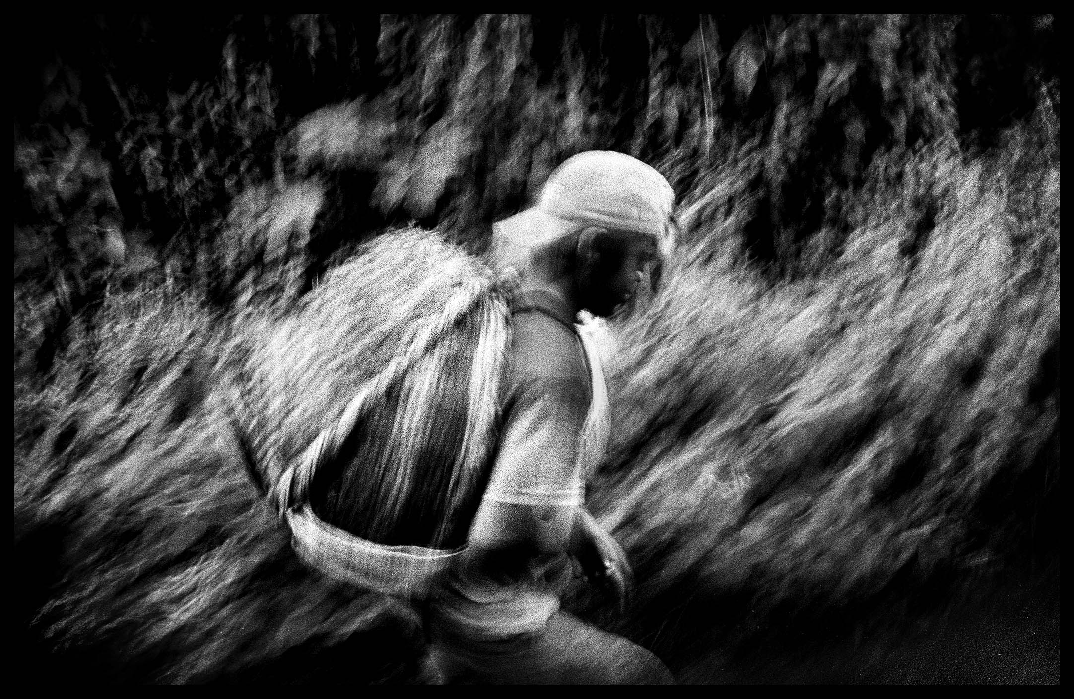Iba trazando un pequeño caminito por el que poder ir adentrándonos en la jungla a golpe de machete. Era diestro de cojones el abuelo! Tras un buen rato de amena caminata entre anécdotas y enseñanzas a este pobre inculto niño de ciudad, llegamos al epicentro de aquel inmenso vergel en el que se oían las risas de niños a los que era imposible ver. Pero allí estaban. Por lo menos allí debían estar. Conta me dijo: aquí empieza el verdadero viaje. Y sin pensárselo ni un solo instante se lanzó cual kamikaze ladera abajo, por el precipicio que se extendía a ambos lados de la pequeña nada practicada por el frío filo de su “cutacha”. Me parecía imposible que alguien o algo pudiera resbalar –y contarlo, por supuesto- por aquel abismo. Pero bueno, para eso habíamos venido, no? Así que me amarré lo mejor que pude mis Nikon al cuello y para abajo. Descenso a los infiernos no conocidos. El acojono –hacía mucho tiempo que no pasaba tanto miedo- era de película. La bajada de infarto. Pero si mi abuelo podía…